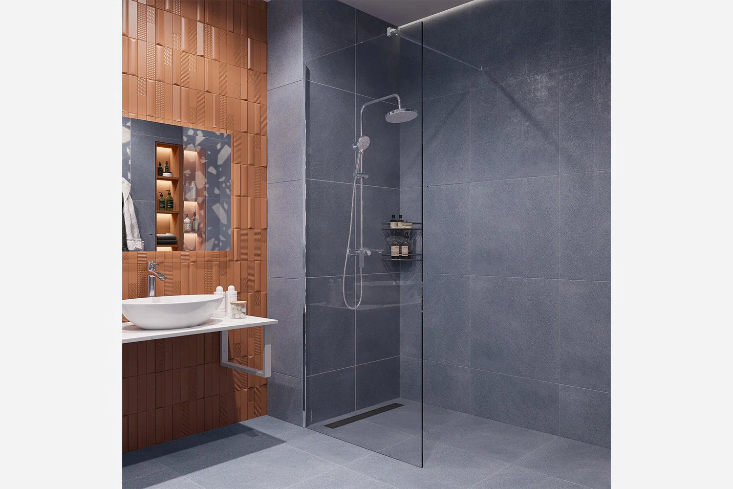 Современная душевая зона без поддона. Обычно используется душевой трап, который монтируется прямо в пол, а пространство отделяется стеклянной душевой перегородкой.